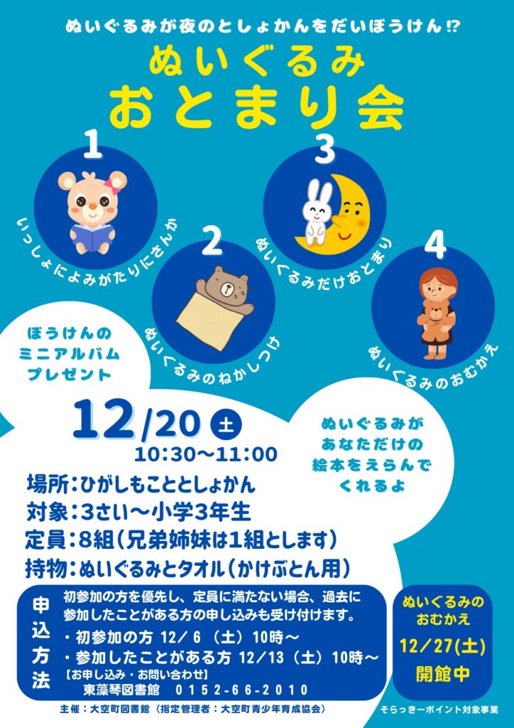 お気に入りのぬいぐるみと一緒に絵本の読み語りを聞いた後、ぬいぐるみは図書館にお泊まりします。夜の図書館でのぬいぐるみの様子を写真に撮ってプレゼントします。初参加の方を優先しますが、定員に満たない場合、過去に参加したことがある方の申し込みも受け付けます。