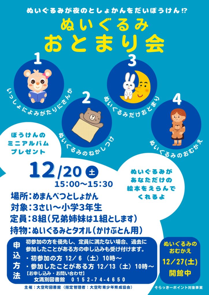 ※ぬいぐるみのお迎えは、1週間後の土曜日(12月27日)の開館時間中にお願いします。
