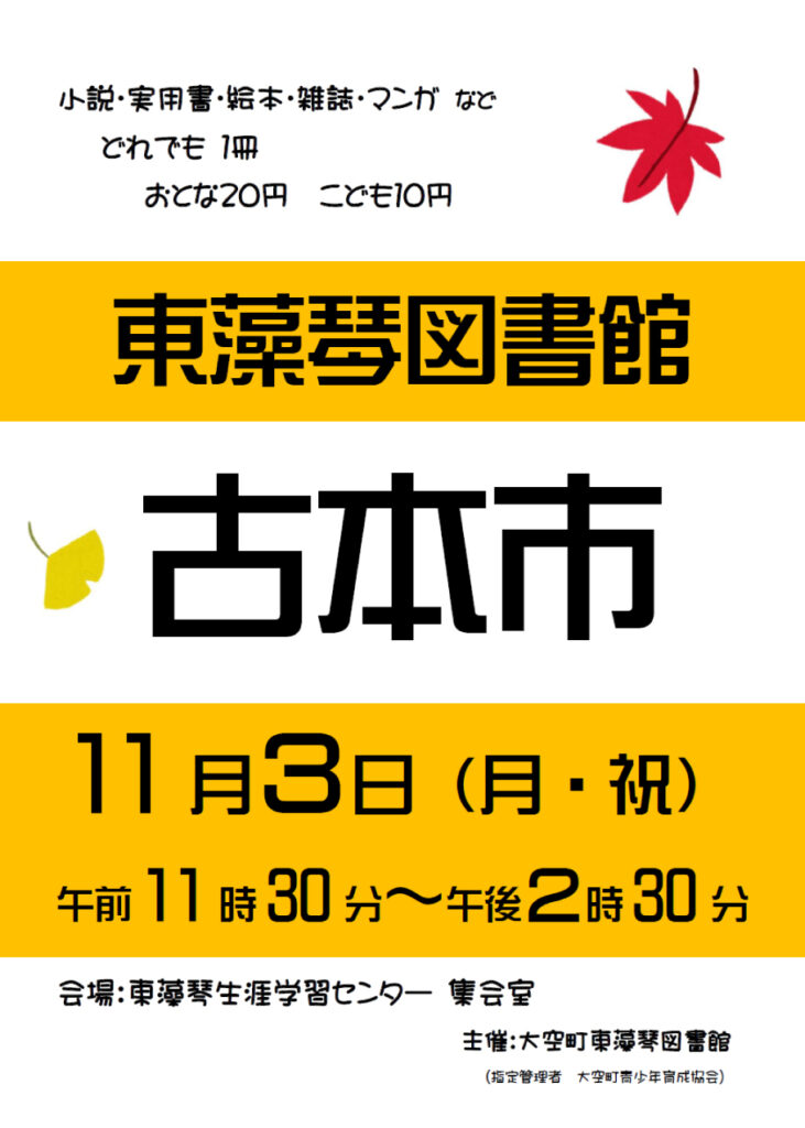 小説、実用書、児童書、絵本、マンガなど、どれでも1冊大人は20円、子どもは10円です。ご来場の際は、本を入れる袋等をお持ちください。ご協力をお願いします。 なお、古本市の収入は、図書館の資料購入に充てられます。皆様のご来場をお待ちしています。